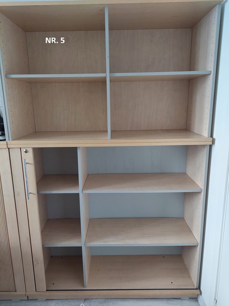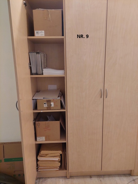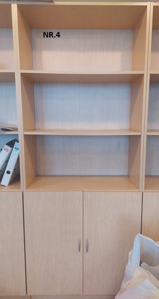 Nr. 5 Skapis ar grāmatu plauktiem un plauktiem dokumentu glabāšanai. Sastāv no divām daļām. Augšējās (bez durvīm) izmērs platums 1,20 m augstums 0,74 dziļums 43. Apakšējās daļas ar durvīm izmēri platums 1,20 m augstums 1,13 m dziļums 0,34 m. 30 EUR (pieejami 2 gabali)