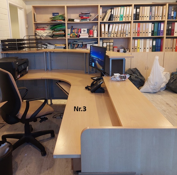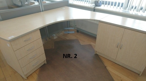 Nr. 2 Lielais rakstāmgalds ar atvilktnēm un skapīti. Izmērs: garākā mala 2,00 m x īsākā mala 1,70 m x augstums 0,72 m - 30 EUR katrs (pieejami 3 gabali)