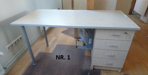 Nr. 1 Rakstāmgaldi ar atvilktnēm. Diviem galdiem atvilktnes kreisajā pusē, vienam labajā. Galda izmērs: garums 1,40 m x platums 0,7 m x augstums 72 cm – 20 EUR katrs (pieejami 3 gabali).
